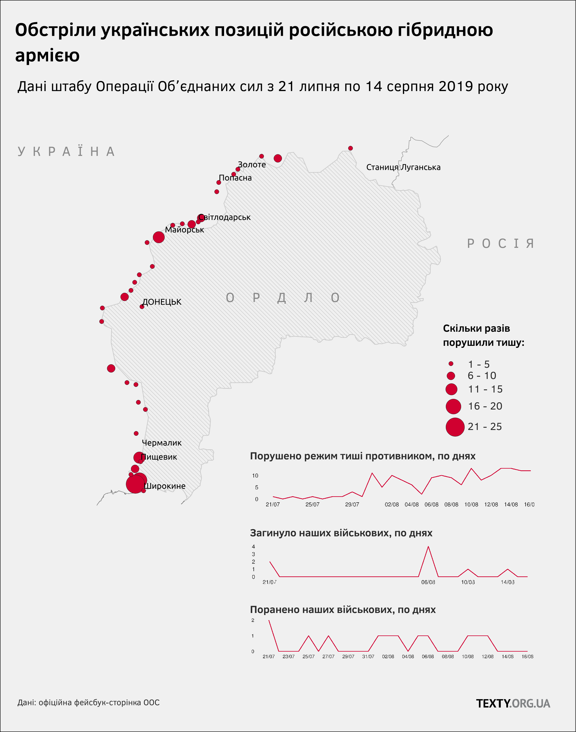 Світові лідери та посли іноземних держав роблять вигляд, що на Донбасі триває перемир’я. Робить це й українська влада. Лише Росія цьому не надає значення: вона продовжує обстріли, продовжує звинувачувати українських військових у тому, що це вони убивають мирне населення. Росії однаково – є перемир’я чи його немає: її населення про цю війну не знає, тому від неї не втомилося. Росії нікуди поспішати. Тож російська гібридна армія на Донбасі продовжує стріляти й убивати українських військових. Бойові втрати – співставні з тими, які були й до оголошення перемир’я. За даними ОСС протягом “миру”, тобто з 21 липня, загинуло 8 бійців, у червні загиблих було 8, у липні – 14.
